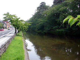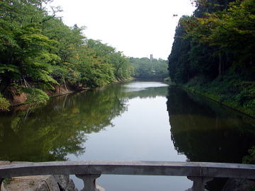 (写真右)杉の大橋から見た中濠。後方左側に辰巳櫓が建つ。