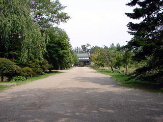 (写真左)手前が三の丸、橋を渡ったところが二の丸で、樹木の間に南内門がわずかに見える。
