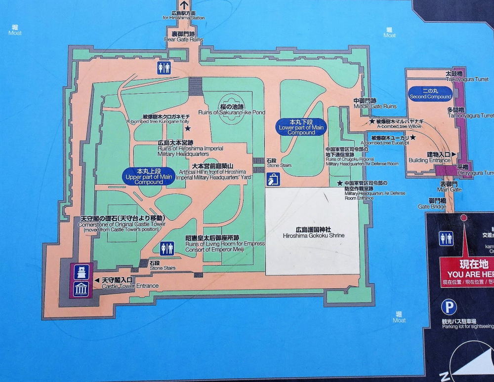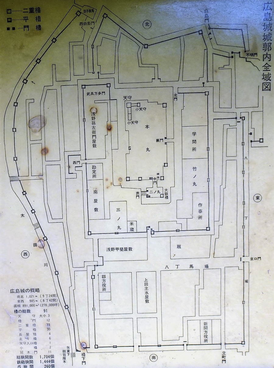 広島城城郭内全域図![]() 現在では、画像中央の本丸・二の丸とそれを囲む内堀が残る(全域図は説明板より) |