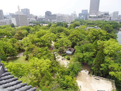 ![]() 北西から復元天守と本丸を囲む内堀を望む |