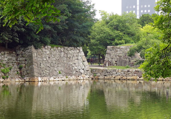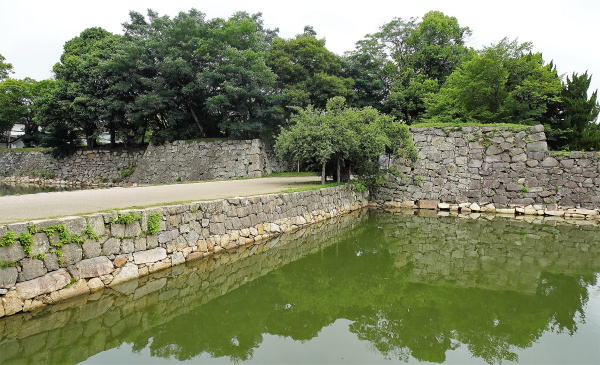 <次は本丸跡・内堀をめぐります>![]() 再建天守と本丸石垣を囲む内堀 |