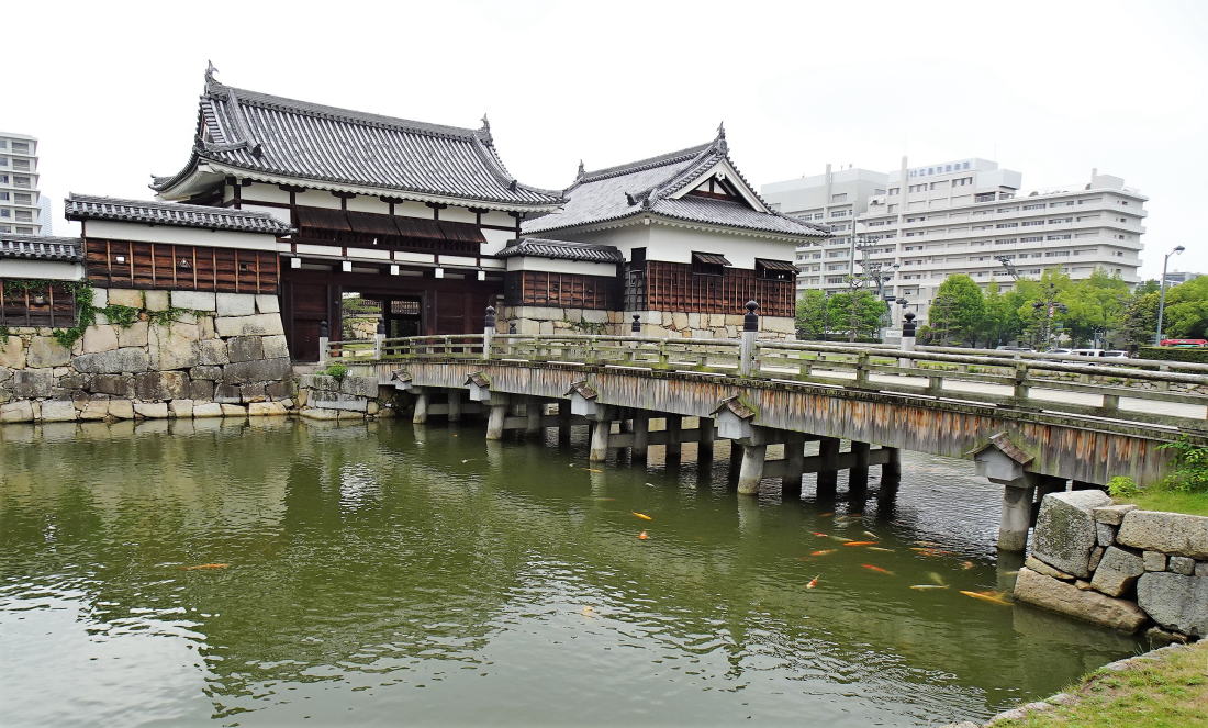 ![]() 左より御門橋、表御門、平櫓(中央)、平櫓の右に多聞櫓が続き右端は太鼓櫓。周囲は内堀で囲まれている |