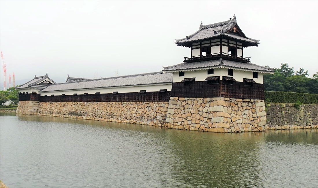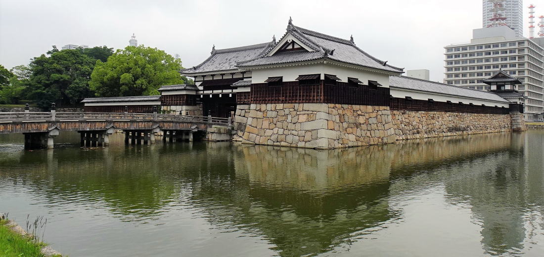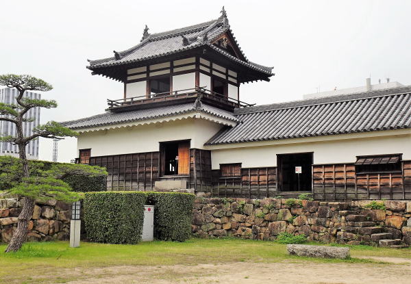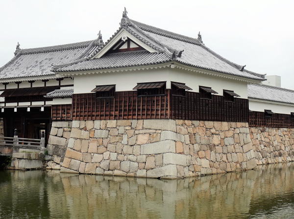 ![]() 右より、太鼓櫓(2階建)、その太鼓櫓と左端の平櫓を連結する多聞櫓(渡櫓)の眺め。堀は内堀 |