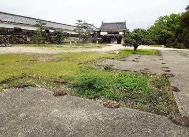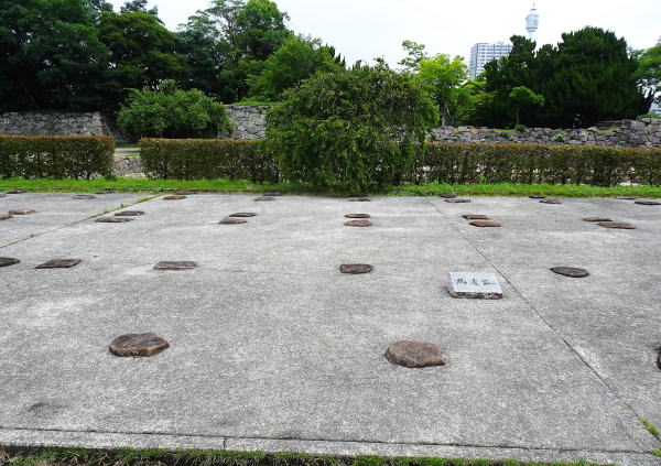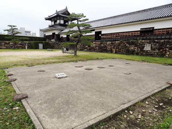 ![]() 番所跡 番所は、城門を出入りする人を監視する場所。現在は遺構の配置を示す展示がされています。後ろの建物は、太鼓櫓と多聞櫓。 |