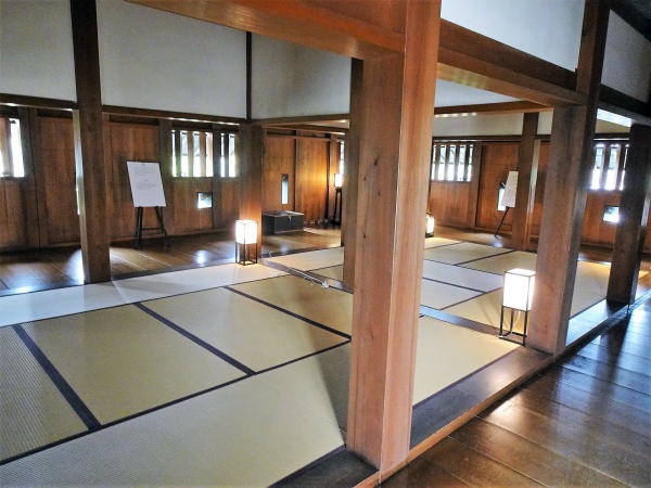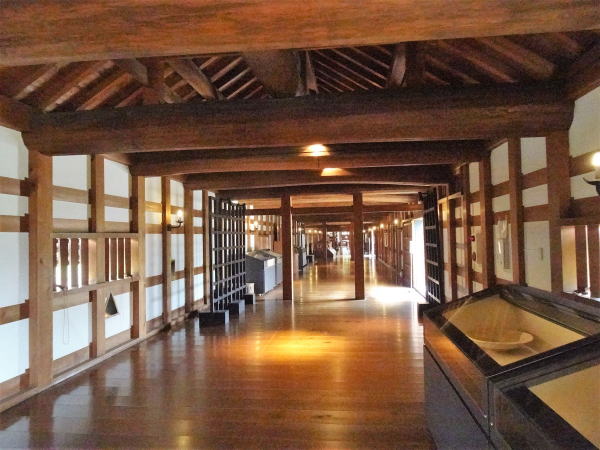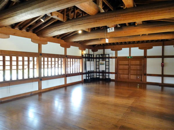 ![]() 多聞櫓の内部 木造一重渡櫓、切妻造、本瓦葺。隅櫓と隅櫓の間を土塀とするよりも、多聞櫓の方が防御力が高く、平時は倉庫や住居として使用することができた。平成6年8月に完成。 |