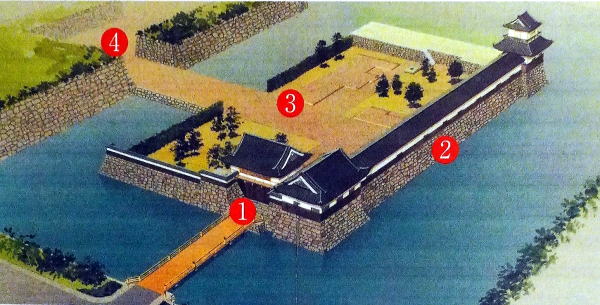 ![]() 本丸跡から二の丸跡を望む 左より太鼓櫓(2階建)、太鼓櫓に接続して多聞櫓が延び、右端は平櫓となる。平櫓に隣接するのは表御門。画像右端の土橋は、中御門(本丸)に通じる。 |