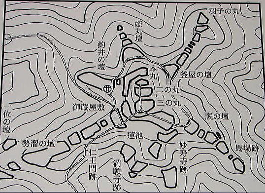 《厩(うまや)の壇跡》![]() 三の丸東から東南方にのびる約400mの尾根の基部で、壇の下に馬場がある。 |