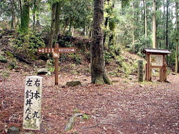 《釣井の壇跡》![]() この壇に直径2.5mの石垣井戸があり、本丸に最も近い水源です。 今は埋もれて深さ約4mとなり、水は沸いていません。木材で四角に囲まれているところが井戸跡。 |