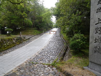![]() 高石垣上部からの眺め この写真と、下の写真は以前訪問した時のものです。石垣右側の建物は上野高校です。 |