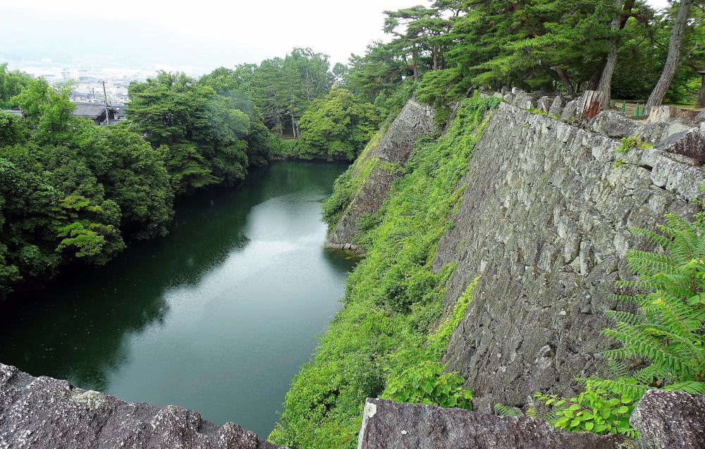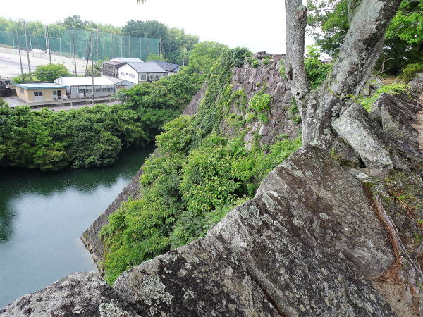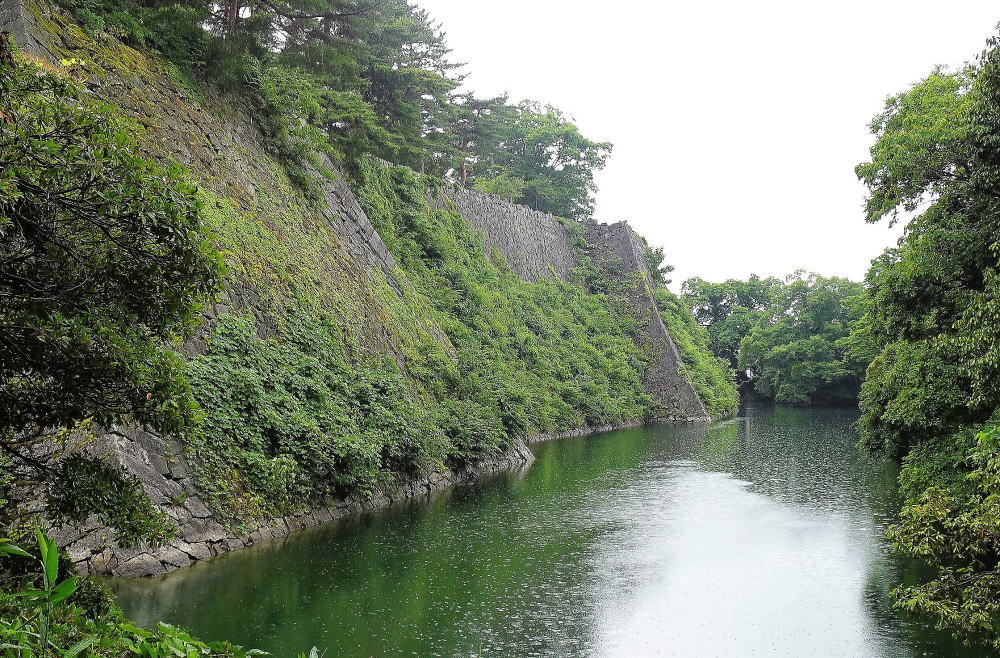 ![]() 南から見た高石垣と内堀。「打込はぎ」の石垣は29.5mの高さを誇る。 |
