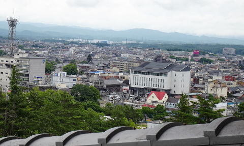 ▼上野市駅(忍者市駅)から見た伊賀上野城天守![]() ▼天守から望む伊賀市上野市街地。 右下の赤い屋根とクリーム色の建物は上野市駅(忍者市駅)。 かつては、この辺りも城内であった。 ![]() |