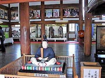《藤堂高虎と上野城天守》 藩祖、藤堂高虎は、慶長13年(1608)8月、伊予国から伊賀国10万石、伊勢国の内10万石、伊予国の内、2万石に移封となった(のち32万3.954石余となる)。高虎は徳川家康の信任が厚く築城の名手でもあった。前城主、筒井定次が築いた上野城の本丸を慶長16年(1611)に豊臣方に備えて西に拡張し、高さ約30メートルの高石垣をめぐらした。 5層の天守閣は建設中の慶長17年(1612)9月2日、当地を襲った大暴風雨のため倒壊した。しかし、慶長19年(1614)の大阪冬の陣と翌年の夏の陣で徳川方が勝利し、幕府は諸大名の城普請を禁じたためこの城では天守閣が再建されないまま城代家老が置かれて伊賀国の城として幕末まで存続した。 現在の天守閣は、当地出身の政治家、川崎克氏が文化産業振興の城として復興を志し、熊野の山林家、奥川吉三郎氏らの協力を得て私財を投じて資金を調達し、昭和10年(1935)10月18日に落成した。「伊賀文化産業城」と名付けられ、その優雅な姿から「白鳳城」とも呼ばれ親しまれている(説明板より)。 (写真は大天守1階に置かれている藤堂高虎像) |