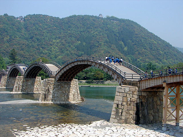錦帯橋(きんたいきょう・国名勝)は3代藩主吉川広嘉(ひろよし)が、1673年(延宝1)、藩庁と城下を結ぶために錦川に創設した。5連アーチの名橋として、城下町岩国のシンボルとなっている。