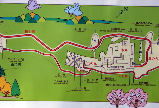 城郭案内図(現地説明板より)岩国城ロープウェー山麓駅から山頂駅まで所要時間3分。山頂駅から天守まで徒歩5分。 岩国城天守閣は、天守閣跡(旧天守台)より南の山ぎわに建造され、史料をもとに、桃山風南蛮造りといわれる当初の様式に復興。 城山(横山)には、曲輪跡(本丸・二の丸・北の丸・出丸)・空堀・天守台・大釣井・大手門跡などが残る。 |