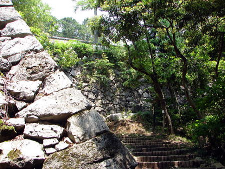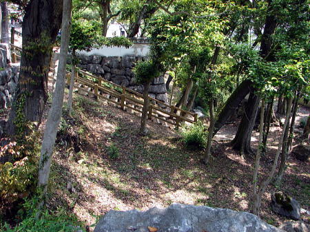 ![]() 出丸跡 大手門跡へ上がる階段と、後方は本丸となる。 |