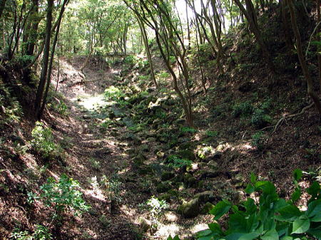 ![]() 天守へ至る道 搦手側の道で、この先には大釣井・空堀がある。 |