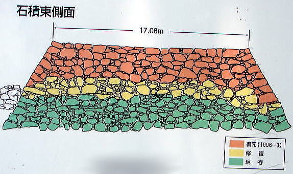 復元された旧天守台<石積東側面> ![]() 旧天守台は上部が破壊されていたが、近年その部分も復元された。 |