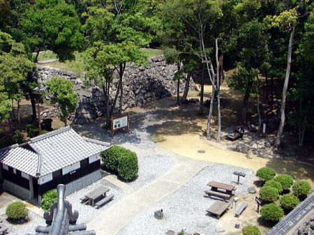 ![]() 復興天守から望む旧天守台 平屋の建物はトイレ。 |
