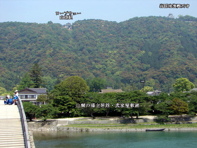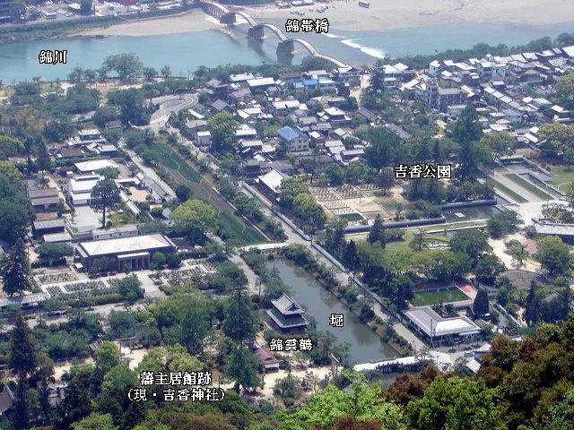 錦川が「つ」の字を描くように城下町を抱いて蛇行している。城下町から錦帯橋を渡ると武家屋敷・居館跡となる。