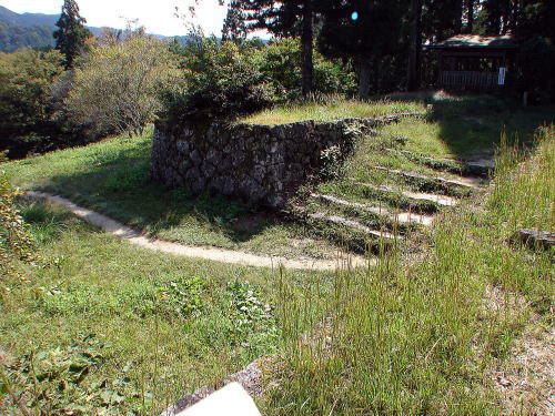 ![]() 長局曲輪から見た枡形虎口の石垣 石垣上のあずまやは、昇龍の井戸。 |