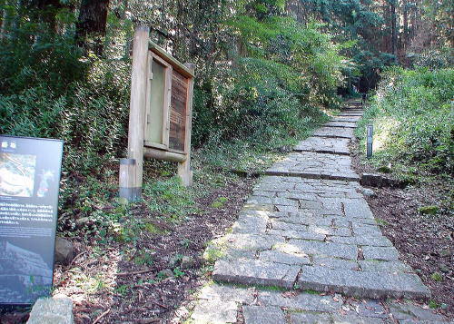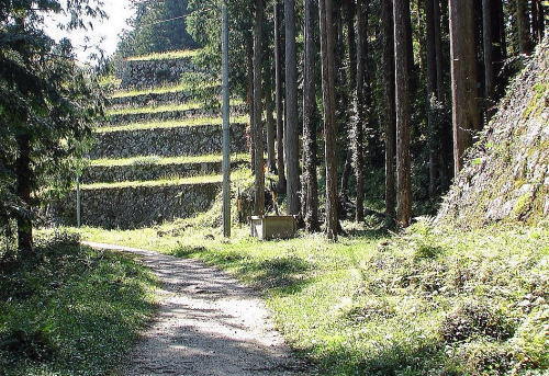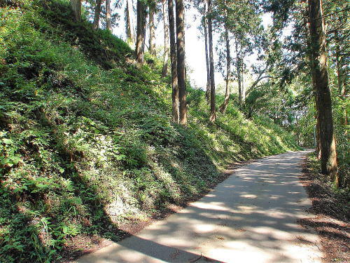 ![]() 本丸裏手の切岸 本丸の裏手には、部分的に石垣にしていない土の遺構が残る。道路の右方向に南曲輪が残り、道路の手前方向に向かうと出丸に至る。 |