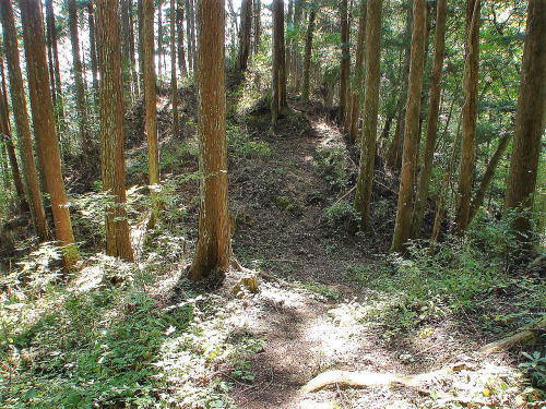 ![]() 南曲輪跡の土橋と堀切 本丸の南の尾根に伸びる戦国時代の遺構で、堀切や竪堀、土橋などの遺構を観察することができる。なお「南曲輪」は仮称である。 |