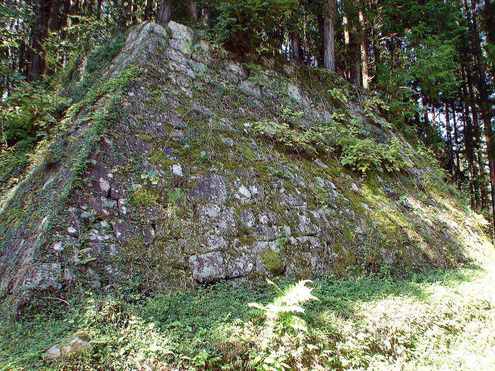 ![]() 出丸から見た本丸石垣(南西側) 石垣下の一帯は帯曲輪。左下の細い坂道を登って、石垣の向こう側を右に曲がった先に、右上写真の埋門が位置する。 |