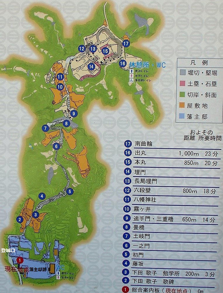 | ■岐阜県指定史跡「岩村城跡」のあらまし 岩村城は別名を霧ヶ城といい、天然の峻険な地形を活用した要害堅固な山城で、標高717mに位置し、江戸諸藩の府城の中で最も高所にあり日本三大山城の一つである。 城の創建は鎌倉幕府初代将軍、源頼朝の重臣加藤景康が、文治元年(1185年)に遠山荘地頭に補せられたのに始まると伝わる。景康の長男景朝が岩村に移り、加藤の姓を地名の遠山に改め、以来遠山氏が代々居城し、東濃地方から信州の一部まで勢力下とした。 戦国動乱の時代に入り、天正元年(1573年)武田信玄の臣秋山虎繁(信友)が岩村城を奪取して入城したが、同3年に織田信長の軍に攻略されて、河尻秀隆が城主となった。その後は森長可、森忠政、田丸直昌と、城主は目まぐるしく交代した。 慶長5年(1600年)の関ヶ原合戦以後は、大給松平本家の松平家乗が城主となり2代、丹羽氏5代のあと大給松平分家の松平氏7代を経て明治維新を迎えた。 城郭は中世城郭を近代城郭へと修築し、本丸二の丸、出丸、帯曲輪、東曲輪、八幡曲輪等が設けられ、丸と曲輪は石垣や堀切をもって区画され、要所に櫓、堀、門が構えられた。 山城の建造物は明治6年(1873年)の廃城令を受けて競売に付され、すべて取り壊された。(現地説明板より) |