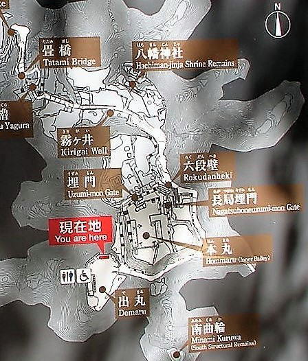 ![]() 本丸は上下2段の曲輪からなっており、東と北には一段低い位置に長局と呼ばれる細長い曲輪が付属する。上段には納戸櫓など二重櫓が2基、多門櫓2基が石垣上に構えられ、門が3基設けられていた。それ以外は内部には施設はなく、広場となっていた。(文と絵図は現地案内板より) |