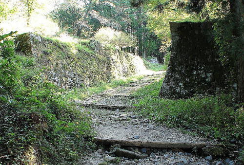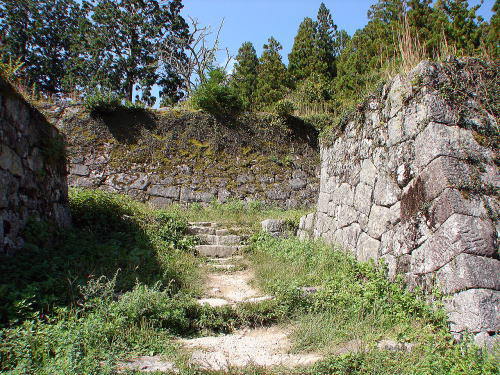 ![]() 長局埋門(ながつぼねうずみもん) 六段壁左の石段を登った所に残る。写真には写っていませんが、手前の一段低い曲輪が東曲輪となる。両側の石垣の上に多門櫓を載せ、石垣の間に門を設けた櫓門。 |