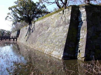 ![]() 御角櫓跡の石垣 御角櫓は、一段高い石垣上に建っていた。手前の低い石垣から南側は二の丸跡。水堀の後方(北側)は、御楼門前の石橋。 |