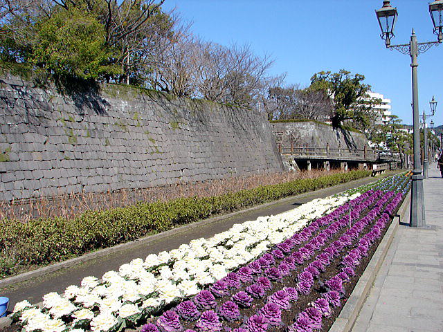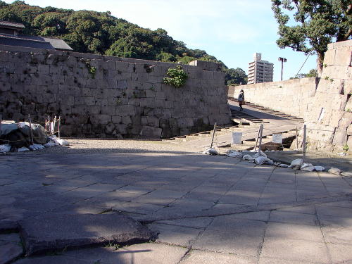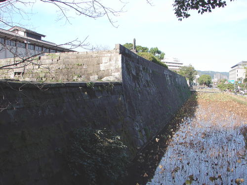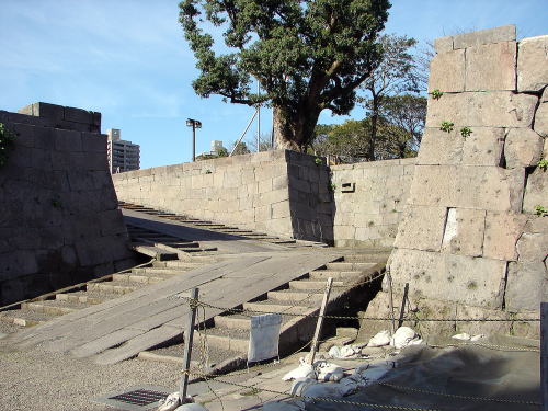 ![]() 鬼門避けの入隅(いりすみ) 本丸多門櫓跡(県民交流センター側)の石垣隅は、角を切り取った形になっています。これは城の北東に当たる「鬼門」とみなし、その災厄を除こうとしたと考えられ、「隅欠(すみおとし)」と呼ばれている。左奥は、御楼門跡と石橋。 |