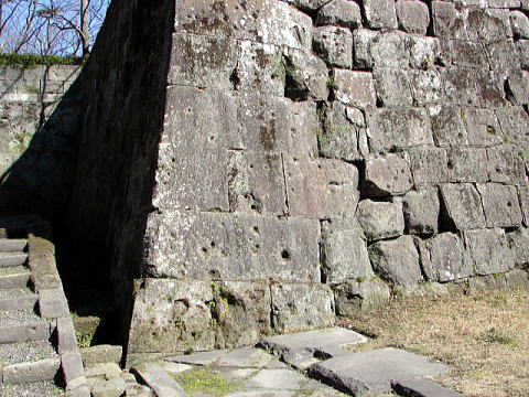 ![]() 本丸の枡形虎口 御楼門の内側を直角に折り曲げた内枡形を造っている。周囲の石垣は「切り込みはぎ」という手法で積み上げ、隅の部分は「算木積」の工法が用いられている。左に曲がった所の状況が右の写真。 |