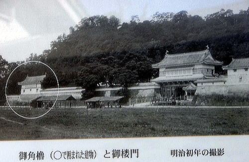 ![]() 明治初期の鹿児島城(城内説明板より) 御角櫓と大手門にあたたる2層、入母屋造りの御楼門。 |