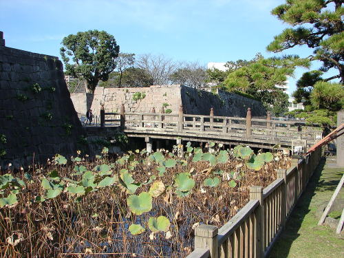 ![]() 水堀に架かる石橋と御楼門跡 水堀は城の3方を取り巻いていた。橋は当初は木橋であったが、1810年(文化7)に石橋に掛け替えられた。 |