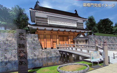 ![]() 御楼門完成イメージ(現地案内板より) 鹿児島県では、「御楼門」「御角櫓」「城壁」を建設するため、平成32年3月の完成に向け、取り組みを進めている。 |