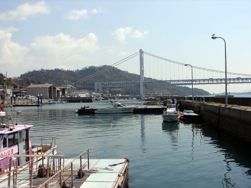 ▲下津井漁港(旧下津井湊)〜前方に見えるのは、下津井瀬戸大橋と鷲羽山。