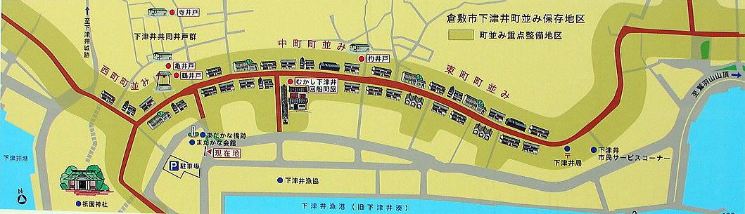 ▲むかし下津井回船問屋周辺図〜下津井は児島半島の最南端に位置し、「西国の喉首」と言われた瀬戸内海航路の要衝であった。
