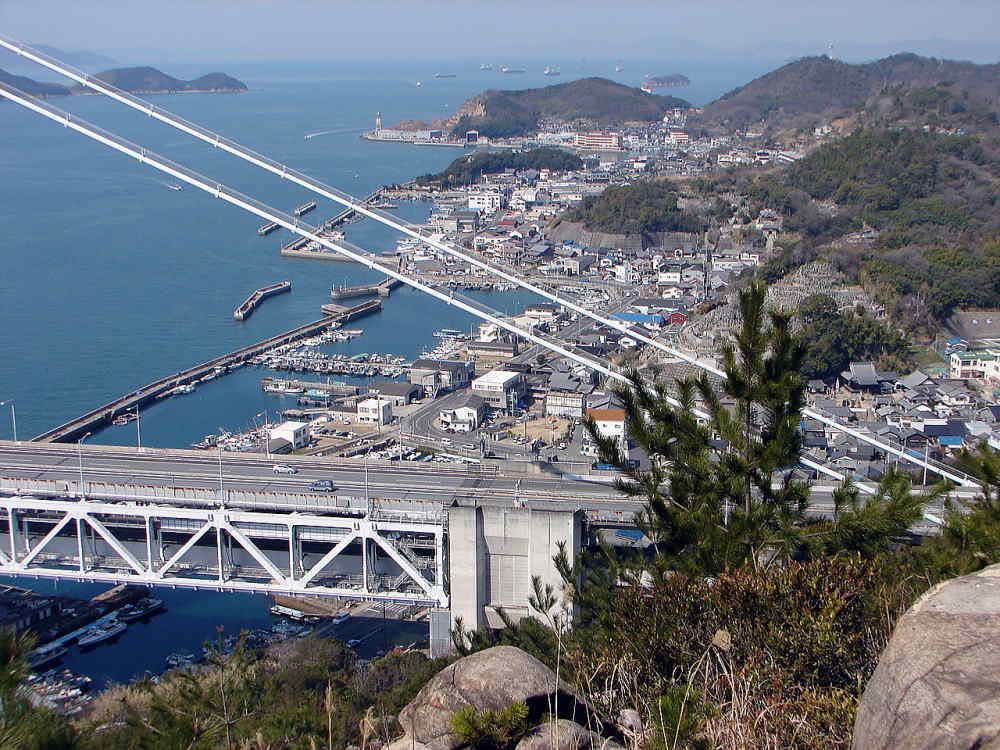 ▲鷲羽山から下津井瀬戸大橋越しに望む下津井町並み