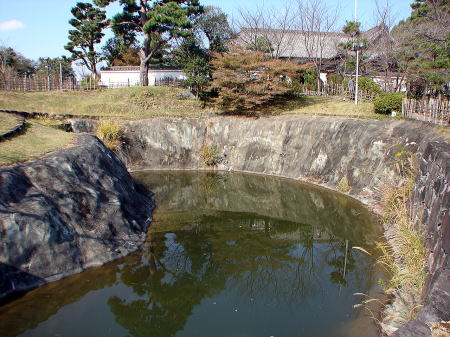 ![]() ▲三日月堀 本丸門の前面に配置された三日月状の堀。深さは8mあり、調査では、堀の南側から石垣が見つかった。 |