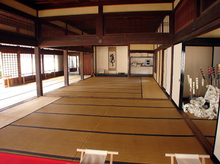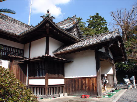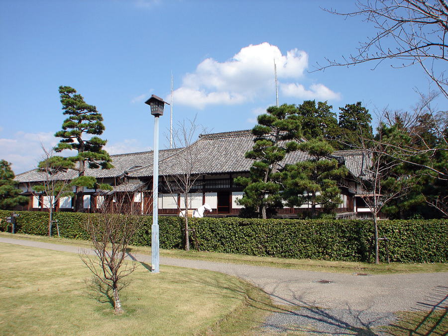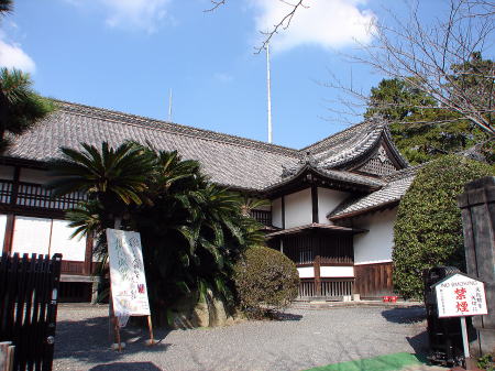 ![]() ▲御殿入口 書院(左側部分)と玄関(右側部分)。書院造と呼ばれる建築様式で、畳を敷きつめた多くの室が連なっている。当初は、本丸にも御殿が造られたが、老朽化したり災害にあって、二の丸に移った。 |