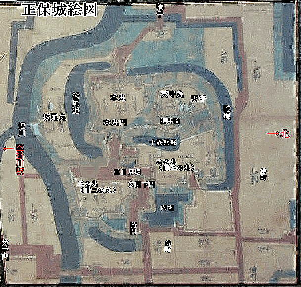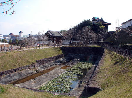 ![]() ▲十露盤(そろばん)堀 本丸を囲む重要な堀。十露盤堀という名称の由来は不明であるが、水が溜まった部分がそろばんの箱のように見えることが、その由来と考えられる。 |