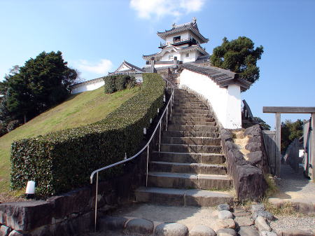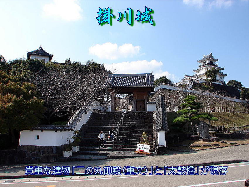 ![]() 大手橋から望む逆川と「東海の名城」掛川城 城の主要部分の守りを担っていた逆川は、現在では改修により当時の面影は失われている 【掛川城の歴史】 掛川城は戦国時代の文明年間(1469〜86)、駿河守護大名今川義忠(よしただ)が遠江支配の拠点として、重臣朝比奈泰熈(やすひろ)に築かせたといわれています。桶狭間の戦(1560)で今川義元が織田信長によって倒されると、永禄11年(1568)義元の子氏真(うじざね)は武田氏に駿河を追われ、掛川城に立て籠もりました。翌年、徳川家康は、掛川城を攻め長期にわたる攻防の末、和睦により開城させました。家康領有後、重臣石川家成(いえなり)が入城し、甲斐からの武田氏侵攻の防御の拠点となりました。天正18年(1590)全国平定を達成した豊臣秀吉は、徳川家康を関東へ移すと、家康旧領地には秀吉配下の大名を配置し、掛川城には山内一豊が入りました。一豊は多くの戦乱により傷んだ城の改築や城下の整備を行なうとともに、この時初めて天守閣をつくりました。 江戸時代には、掛川城は徳川親藩の松平氏や、江戸城を築いた太田道灌の子孫太田氏など11家26代の居城として栄えました。貴族的な外観をもつ天守閣の美しさは「東海の名城」と謳われました。しかし、嘉永7年(1854)大地震により天守閣など大半が損壊。御殿、太鼓櫓、蕗(ふき)の門などの一部を除き、再建されることなく明治維新を迎え、明治2年(1869)廃城となりました。その後、御殿は様々に使用されながら残りましたが、天守台や本丸の跡など一帯は公園とされてきました。掛川市民の熱意と努力が実を結び、天守閣は平成6年140年ぶりに木造により再建され、ふたたび美しい姿を現わしました。(文は現地パンフより転載) ▼掛川城天守閣〜日本で初めて木造天守閣を復元 ![]() 掛川城天守閣は、外観三層、内部四階から成る。六間×五間(約12m×10m)の天守閣本体は、決して大きなものではないが、東西に張り出し部を設けたり、入口に付櫓(つけやぐら)を設けたりして外観を大きく複雑に見せている。一階、二階に比べ四階の望楼部が極端に小さいのは、殿舎の上に物見のための望楼を載せた出現前の天守閣のなごりといえる。 ▼掛川城御殿〜大名の暮らしを偲ばせる城郭御殿 現存する御殿は、嘉永7年(1854)大地震でそれまでの御殿が倒壊したため、時の城主太田資功(すけかつ)によって、安政2年(1855)から文久元年(1861)にかけて再建された。 ![]() |