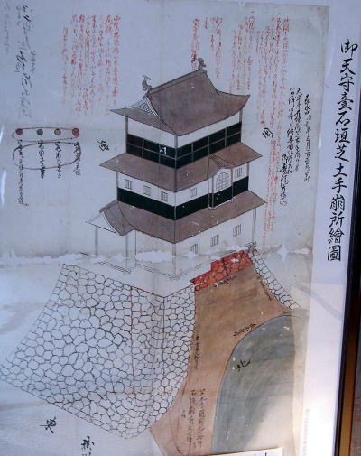 ![]() ▲御天守台石垣芝土手崩所絵図 嘉永4年(1851)に天守台北面の石垣と芝土手が崩落した被害状況を幕府に対して示した絵図控え。幕末段階の天守の様子を伝える貴重な資料である。 |