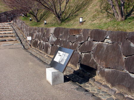 ![]() ▲腰石垣と玉石側溝 調査では、土塁の裾(腰)から、玉石積みの石垣と側溝が見つかった。新たに積まれた登城路の石垣の下に保存されている。 |