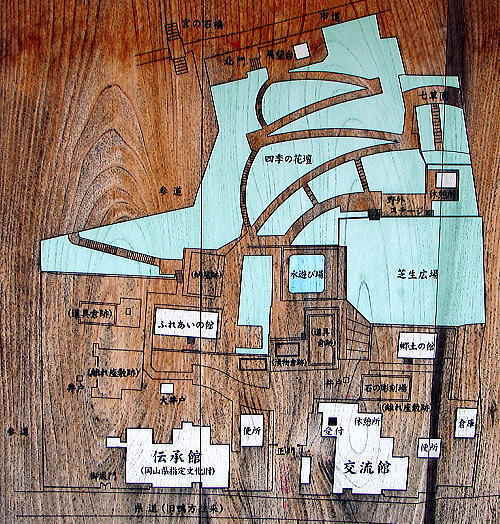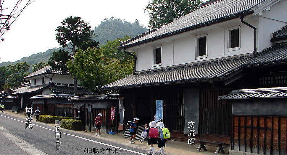 本園は、この往来沿いに並ぶ江戸時代に築造された二棟の町屋をはじめ、蔵、井戸、土塀、庭園等を修復した史跡保存ゾーンと、四季折々の植物が楽しめる伝統植物園や芝生広場、展望台等のある景観ゾーンからなる面積6,600平方メートルの歴史公園です。「鴨方に過ぎたるものが三つある 拙斎、索我、宮の石橋」と昔からうたわれた里謡にあるように、近くには江戸中期の儒者西山拙斎や画家田中索我ゆかりの史跡や歴史の古い寺社、陣屋跡、鴨山城跡などがありこの公園を中心にゆっくりと散策することができます。