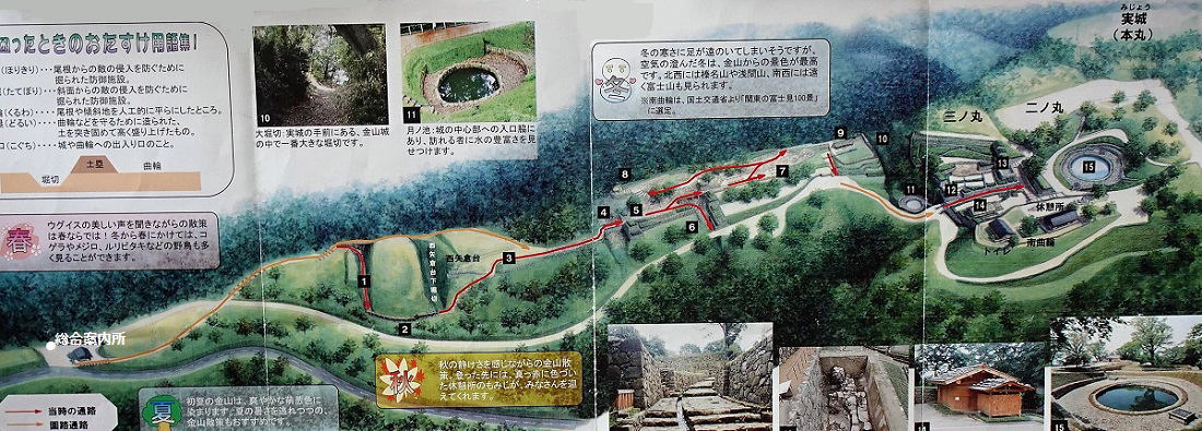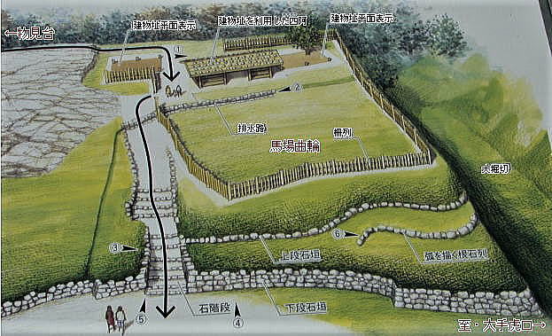 | 絵図番号説明❶西矢倉台西堀切❷桟道❸西矢倉台通路❹物見台下堀切❺物見台下虎口❻竪堀❼馬場下通路❽物見台❾馬場曲輪❿大堀切⓫月ノ池⓬大手虎口⓭石垣改修の露出展示⓮石敷き遺構展示施設⓯日ノ池 ■所要時間 総合案内板⇒❽物見台まで約10分⇒⓬大手虎口まで約15分⇒新田神社(実城)まで約20分 (※以下、画像の説明文については、現地資料、現地説明板を参照) |