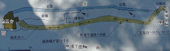物見台から東の南側斜面際では、石敷きされた通路が発見された。この通路は、物見台と東側に位置する馬場曲輪を結ぶと共に、途中で南下にある馬場下通路へと分岐している。(絵図は現地説明板に一部加筆) |