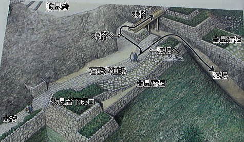物見台下土橋から竪堀までの間には石敷きの通路が発見された。この通路は防御上、土橋から見通せないように曲がった通路となっている。通路は、竪堀にかかる木橋方向と、堀底へ下りる階段へ分岐している。 (絵図は現地説明板に一部加筆) |