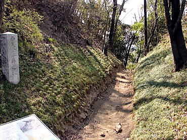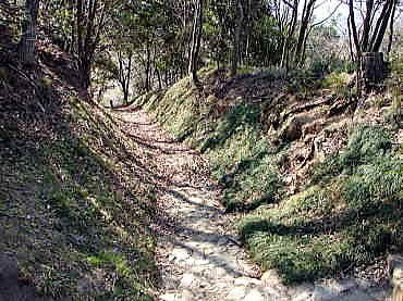 ![]() 正面土塁手前から見た大手通路 この先は大手虎口の門付近。大手通路の両側の平らな部分は曲輪跡です。 |